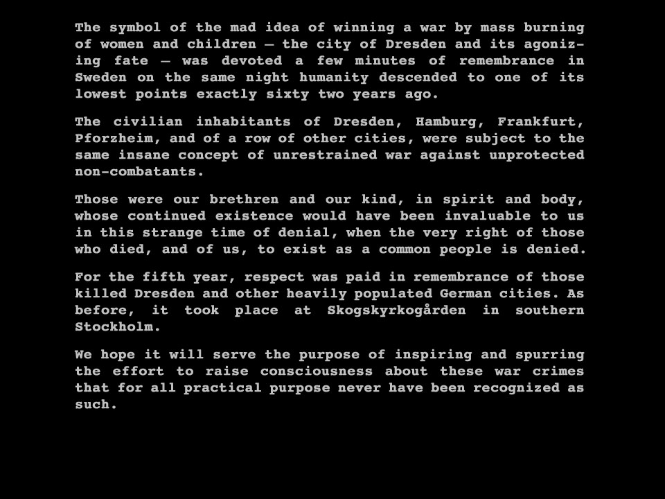 For information on the terror bombing of civilians, see Apocalypse at Dresden: