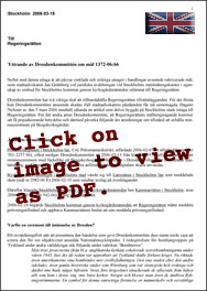 Date: June 5, 2007 Matter: The legal dispute between the City of Stockholm and the Police regarding our licence of assembly Before the Dresden ceremony of 2006, the Cemetery administration of the City of Stockholm opposed the decision by the Police department to grant us permission to hold a public gathering on the cemetery. They appealed against it in the county administrative court, whose judicial decision was to the advantage of the Police (and us). As late as on the 13th of February, the matter had even been settled in the Swedish administrative court of appeal, which also cast its decision to our advantage. At the end of February that year, the City of Stockholm appealed to the Swedish Supreme Administrative Court in order to have the decision of the lower court repealed in case of possible future situations of this kind. We actually didn't know any of this until we almost a month after the remembrance ceremony learned about it in an article in a major Swedish newspaper: